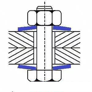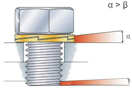 這種墊圈的一面是大斜齒面,在墊圈的另一面有放射狀鋸齒。NORD-LOCK墊圈是大齒面相對(duì),成對(duì)安裝的。當(dāng)擰緊螺栓或螺母時(shí),放射狀鋸齒緊緊咬住接觸面,使NORD-LOCK墊圈分別與螺母和連接件接觸面相對(duì)固定,只允許大斜齒面間的相對(duì)移動(dòng)。螺栓或螺母的任何松動(dòng)趨勢(shì)都被大鋸齒的這種楔入效果所阻止。兩片NORD-LOCK墊圈之間的抬升距離大于因螺紋滑動(dòng)引起的螺栓或螺母抬升的距離。